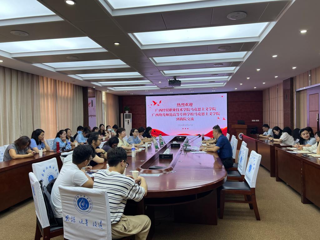 6月17日下午3点,广西幼儿师范高等专科学校、广西经贸职业技术学院开云kaiyun体育一行31人到开云官网调研交流。开云kaiyun体育直属党支部书记、院长石乾福,副院长汪琦佳,教研室主任戴高蕙及部分思政课教师在春晖楼四楼会议室开展座谈会,会议由石乾福主持。