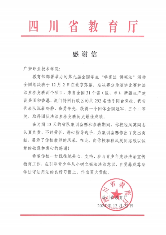 2024年12月23日,四川省教育厅向开云官网教师程凤英发来感谢信,对程凤英在教育部部署举办的第九届全国学生“学宪法 讲宪法”活动全国总决赛中积极提供重要的人力支持,高质量完成相关工作给予高度认可和积极鼓励。
