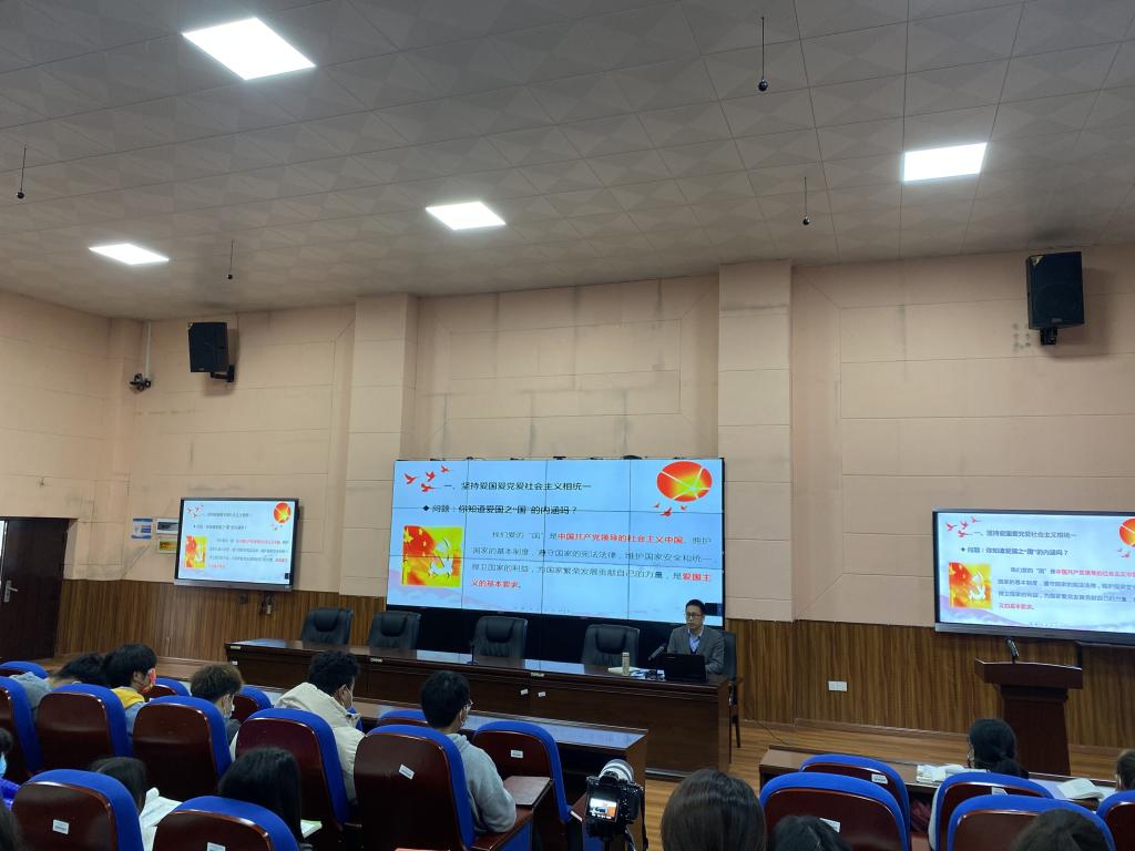 王义全结合刚刚结束的十九届六中全会精神,以提问“怎样做新时代的忠诚爱国者”开始了本节课的教学,他分别从爱国、爱党、爱社会主义三个方面论述了作为新时代青年大学生如何成为一个忠诚的爱国者。他用自己的亲身经历做分享,从过去、现在、将来社会主义发展的唯物史观等角度,深刻剖析了没有党,哪有国,没有国,哪有家,没有社会主义,哪有强国等爱国爱党爱社会主义的本质和内在联系;运用马克思主义理论分享了中国特色社会主义进入新时代,实现中华民族伟大复兴的中国梦是新时代爱国主义的鲜明主题。