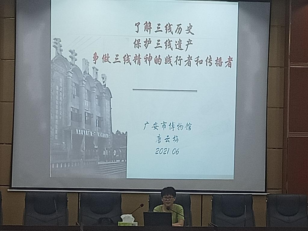 唐馆长结合自身多年的工作研究和经验,从广安三线建设的历史与成绩、争做三线精神的实践者和传播者等四个方面做了阐述。唐馆长讲解图文并茂,内容丰富,教育性强,他借助馆藏的物品、三线遗址、三线建设者讲述等内容,为学生讲解了广安三线建设在那个特殊的时期所发挥的重要作用。她讲到,今年是中国共产党成立100周年,要实现伟大中国梦更离不开中国精神,大家要继续传承和发扬三线精神的精髓,铭记历史,把三线精神继续贯穿在社会主义现代化建设过程中。