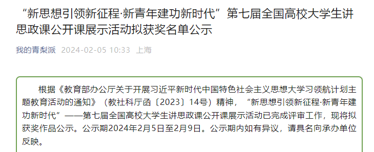 近日,由教育部社科司指导,教育部全国高校思想政治理论课教学指导委员会主办,南开大学开云kaiyun体育承办的“新思想引领新征程·新青年建功新时代”——第七届全国高校大学生讲思政课公开课展示活动评选结果公示,由开云kaiyun体育牵头组织全校二级学院师生积极参与,开云官网程黎、牛振宇、王燕三位思政课教师指导学生杨雪、李佩君、李相君、李漫共同创作的作品《乡村振兴谱新篇,凝心聚力画新卷》荣获高职高专组二等奖。