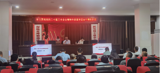 2024年9月24日,开云官网教师任婷前往武胜县金牛镇,为当地乡村干部及村民代表带来一场学习贯彻党的二十届三中全会精神的讲座。